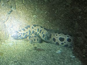 ウツボはモヨウキカイウツボと呼ばれる種。黒いまだら模様が特徴で、全長約50㌢。「内湾の魚」水槽にいる。日中はほとんど砂の中に身を潜めており、見ることができるのは、ほぼ夜間のみだ。