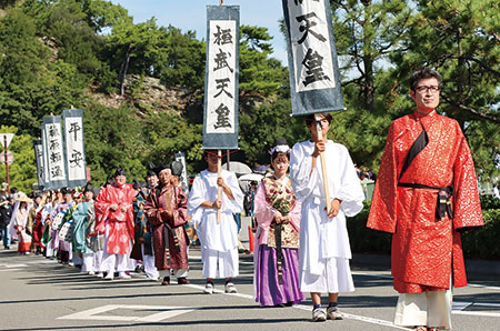 行列は、地元住民らを中心に約300人が、奈良、平安、江戸から明治までの装束をまとい、あしべ橋から片男波公園の野外ステージまで約1㌔を練り歩いた。ステージでは、シンセサイザーコンサートや短歌大会表彰式、また、玉津島神社では、京都冷泉家による和歌披講が行われた。