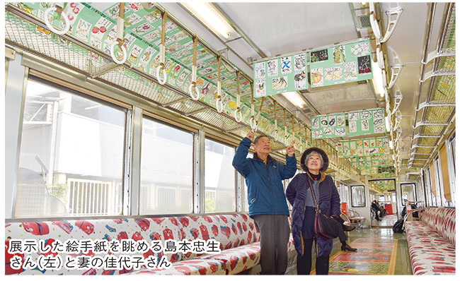 絵手紙電車は11年前、貴志川線の経営危機を耳にした岩出市の絵手紙講師、島本忠生さん(83)が「自分にできることで役に立ちたい」と、妻で同じく講師の佳代子さん(80)と二人で「貴志川線応援絵手紙愛好クラブ」を立ち上げ、発案した。目的は乗客の増加。「自分の作品が展示されれば見に来る人がいるのでは」と考えたのがきっかけだ。2014年の初運行時は1436通の作品が集まり、以降、1500通以上の絵手紙を乗せて5回実施された。