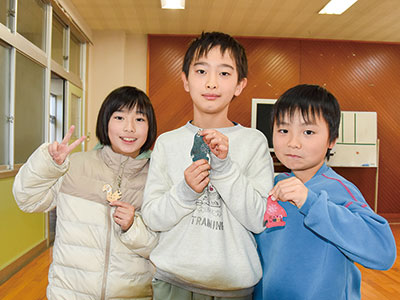 野生動物の食肉利用「ジビエ」について知ってもらおうと県は12月5日㊎、和歌山市六十谷の有功東小学校で出前授業を実施。4年生54人が県内で捕れたシカとイノシシの革を使ってキーホルダーを作った。