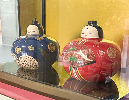 日本三大漆器の一つとして知られる海南市黒江地区の名産「紀州漆器」の技法を活かし、昭和初期に考案された漆塗りのすわり雛。天然素材の木地に漆を重ね塗りし、蒔絵で顔と着物を描いている。つややかな光沢と丸みを帯びた形、穏やかな表情が特徴。設置の紀州雛は1996年に紀州漆器協同組合が製作した特注品で、毎年、桃の節句のこの時季、来庁者の目を楽しませている。