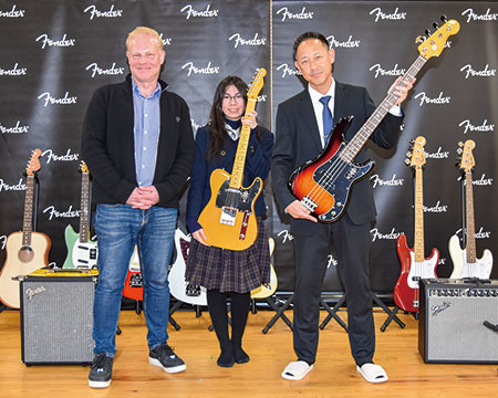 イベントは「Fender Youth Music Program チャリティイベント─和歌山県立和歌山高等学校」と題し開催。同社から贈られたギターとベース10台、アンプ2台、周辺機器など約180万円相当の機材がステージに並べられ、生徒ら約100人が見守った。贈呈式でアジアパシフィック統括ジョルジオ・ゲリーニ次期社長は「私たちの使命は、音楽の世界を探検しようとする若い人たちを心から応援することです」と挨拶。住岡篤校長と同部副部長の原田綾音さん(2年)にギターを手渡した。