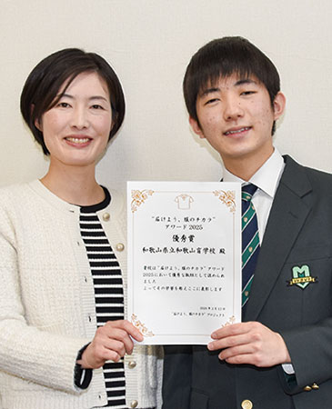 私たちの取り組みが、誰一人取り残さない社会の第一歩に──県立和歌山盲学校(和歌山市府中)が、ユニクロなどを展開するファーストリテイリング主催の2025年度「〝届けよう、服のチカラ〟プロジェクト」で優秀賞を受賞した。全国の参加769校から同校を含む6校が選出。2月12日㊍、東京の国立科学博物館で開かれた表彰式では高等部2年生の木下叶翔さんが活動内容を発表し、賞状を受け取った。