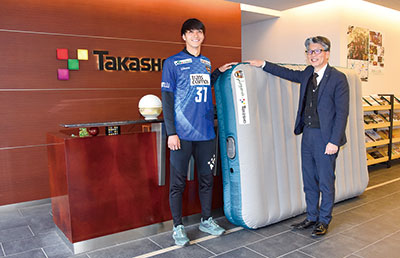 海南市南赤坂の株式会社タカショーは3月18日㊌、和歌山からJリーグ入りを目指すサッカーチーム「アルテリーヴォ和歌山」に自社製のエアマット2台を贈った。贈呈式には同社のグループ会社「ガーデンクリエイト」に勤務する新加入の松野輝樹選手が出席。公門浩取締役から商品が手渡されると、見守った社員から温かい拍手が送られた。
