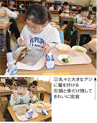 下田佑樹さんは「いつもはもっと身がボロボロになるんですが、きょうはうまくできました」。出水蒼唯さんは「切り身ではなく、頭から尻尾までのアジにちょっとビックリ。でも、全部食べられました」と誇らしげだった。担任の佐武靖夫教諭は「魚を食べて好きになることで、自然を大切にしようという気持ちが芽生えるはず。子どもたちが自然と共生し、育つきっかけになれば」と話していた。